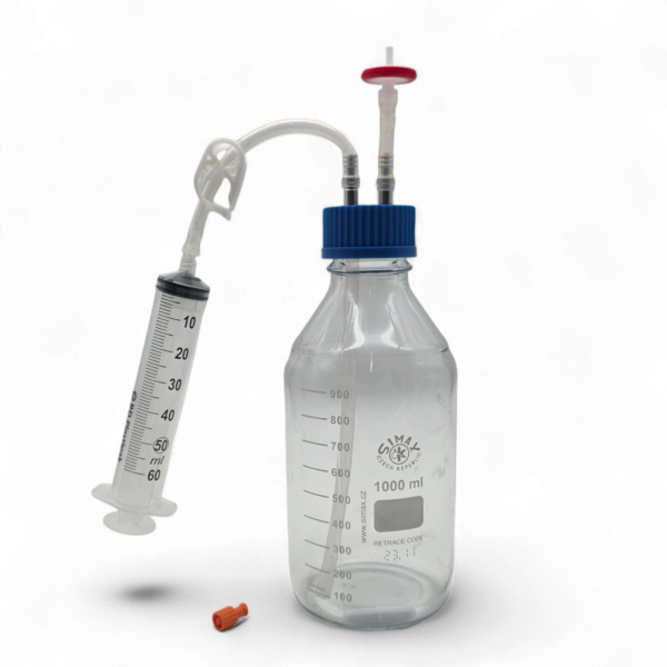 The integrated luer-lock port allows easy filling of syringes without tilting or handling the bottle, making it ideal for use with standard syringes, repeating syringes, or peristaltic pumps. A magnetic stir bar is included to ensure even mixing during incubation or before dispensing.